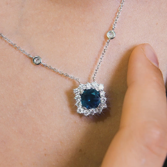 Elegante collana in oro bianco 18 carati che incarna la raffinatezza della gioielleria fine. Il pezzo è dominato da uno splendido zaffiro centrale di 2,28 carati, circondato da diamanti taglio brillante di 0,77 carati totali, colore F e purezza SI. Una composizione che unisce la profondità del blu zaffiro alla luminosità cristallina dei diamanti, creando un contrasto visivo di straordinaria bellezza. Ideale per chi ricerca un gioiello sofisticato e versatile, adatto sia a occasioni speciali che a un uso quotidiano consapevole.