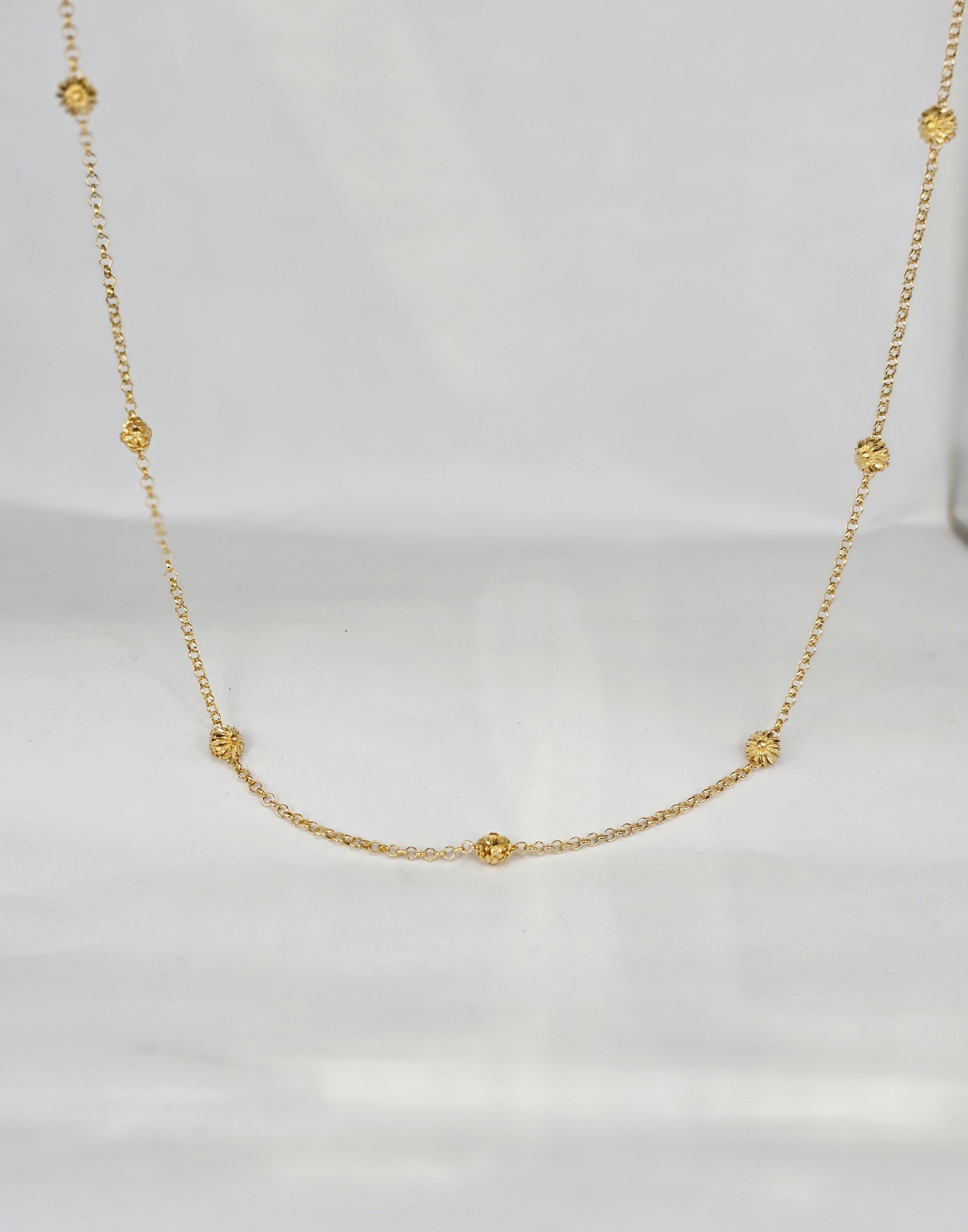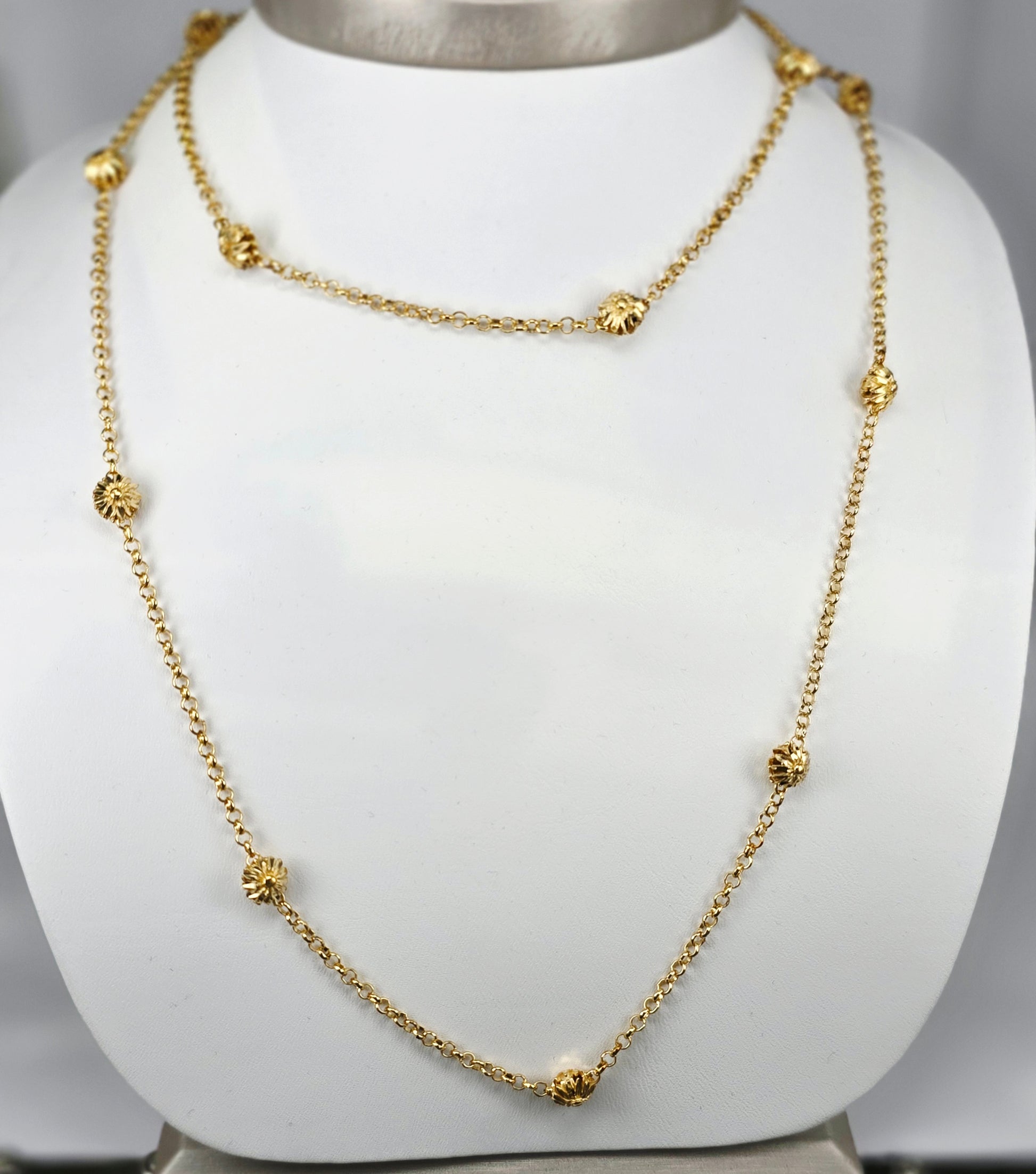 Collana lunga in argento dorato che si distingue per la sua versatilità e raffinatezza. Realizzata con una catena intervallata da delicati dettagli artigianali, ogni elemento è sapientemente lavorato a mano per garantire una lucentezza uniforme e duratura nel tempo. La lunghezza generosa consente di indossarla in doppio giro, offrendo due diverse interpretazioni stilistiche con un unico pezzo. I dettagli manuali conferiscono carattere e personalità, rendendo questa collana un accessorio sofisticato adatto a qualsiasi occasione e a tutte le età. La combinazione di argento e doratura crea un contrasto elegante che si adatta perfettamente sia a look casual che formali, rappresentando un investimento di qualità nel vostro guardaroba.