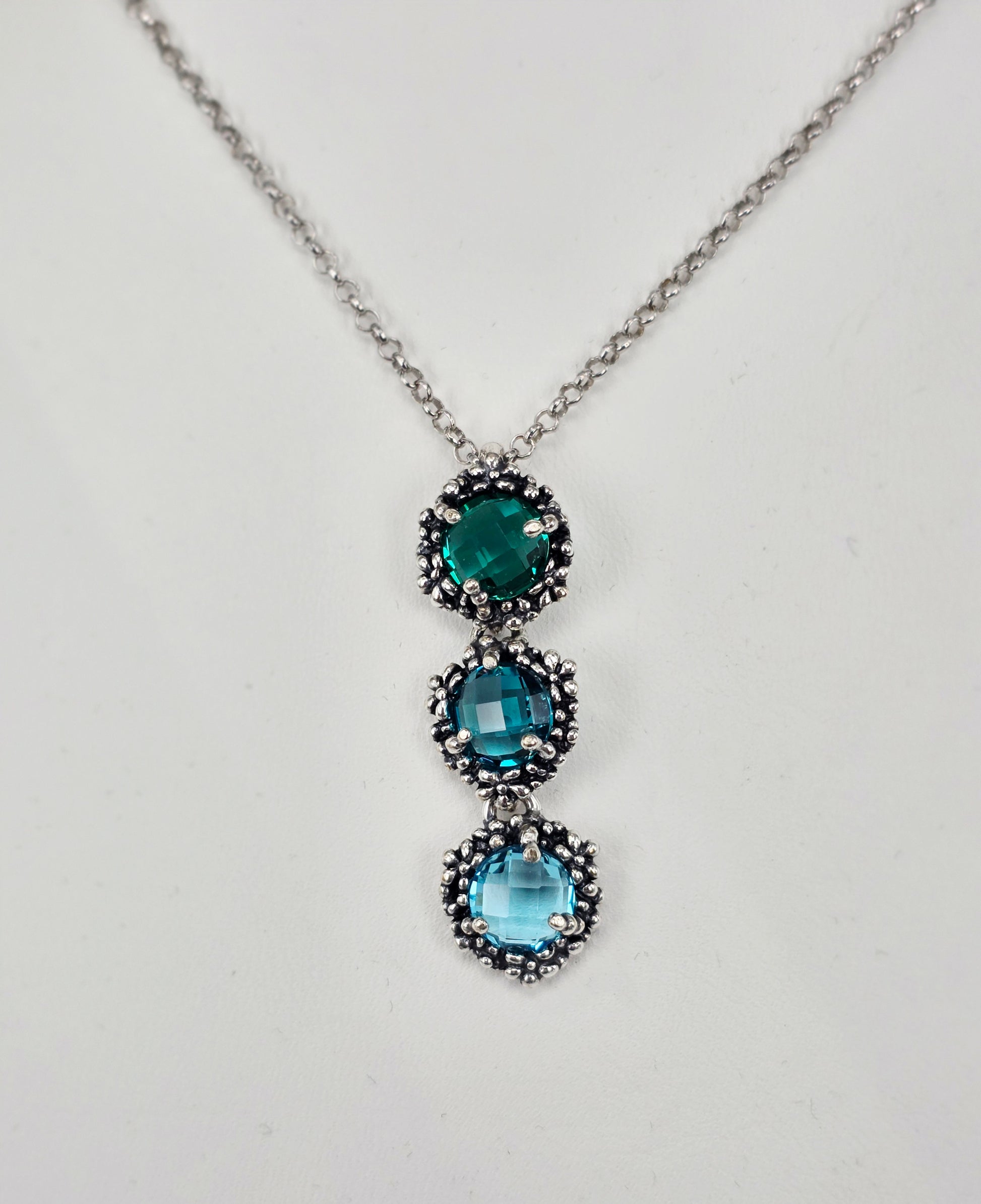 Girocollo in argento della collezione BLUE IVY, un'opera di raffinata eleganza che combina tre cristalli in tonalità verde e azzurro, sapientemente selezionati per la loro trasparenza e brillantezza. Ogni cristallo è contornato da un delicato perlage realizzato a mano, una tecnica artigianale che conferisce unicità e pregio a ogni pezzo. La lavorazione manuale garantisce attenzione ai dettagli e qualità costruttiva superiore. Questo girocollo si distingue per la versatilità: adatto a tutte le età, rappresenta una scelta ideale sia per occasioni speciali che per l'uso quotidiano. La combinazione di cristalli e argento crea un effetto luminoso che valorizza il décolleté, mentre il design senza tempo assicura una longevità stilistica. Un accessorio che unisce tradizione artigianale e contemporaneità, perfetto per chi apprezza la gioielleria di qualità.
