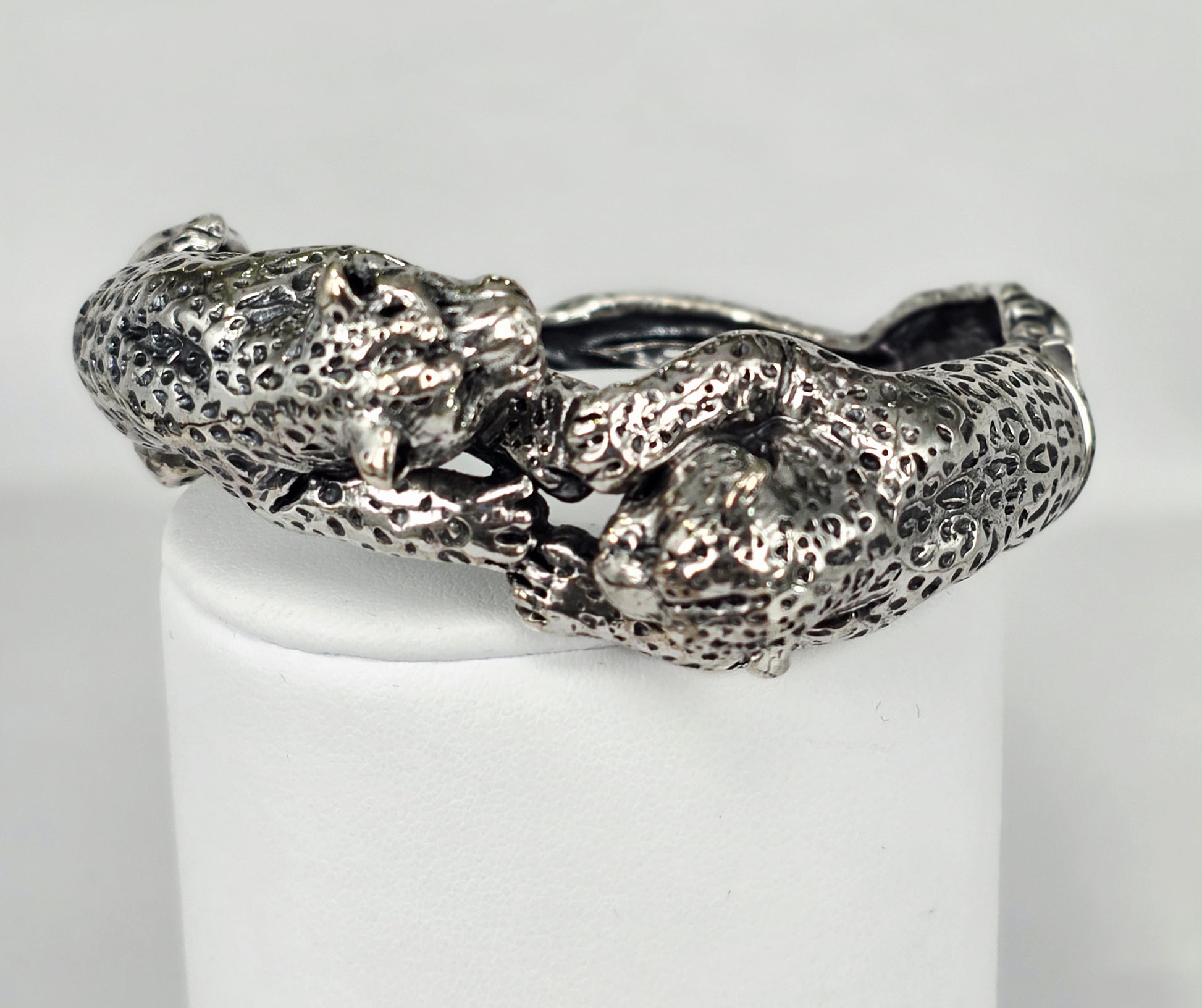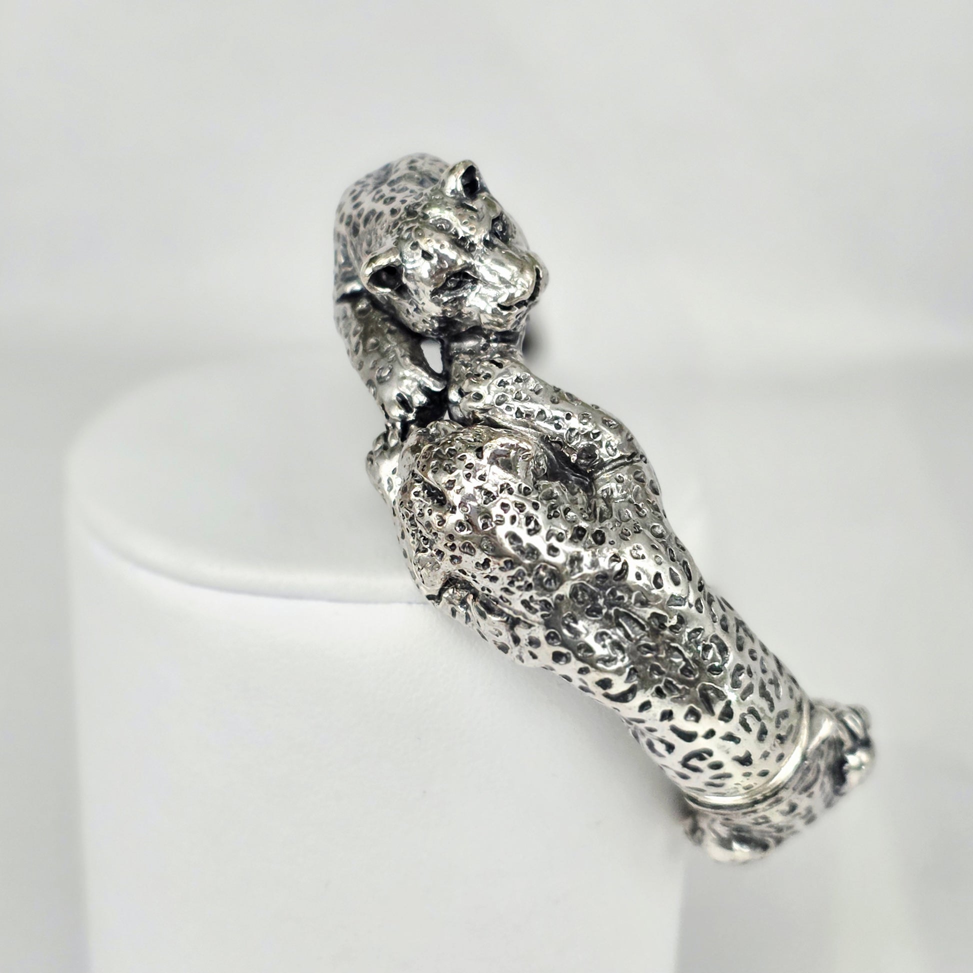 Bracciale in argento sterling che incarna l'eleganza dello stile animalier con due leopardi sapientemente realizzati a mano. Ogni dettaglio è curato con precisione artigianale, conferendo al pezzo un carattere distintivo e sofisticato. La lavorazione manuale garantisce unicità e qualità superiore, mentre il design versatile lo rende adatto a qualsiasi occasione e fascia d'età. Un accessorio che combina l'arte della gioielleria tradizionale con un'estetica contemporanea, perfetto per chi apprezza i pezzi caratterizzati da personalità e maestria tecnica. Indossare questo bracciale significa scegliere un oggetto che racconta una storia di artigianalità italiana.