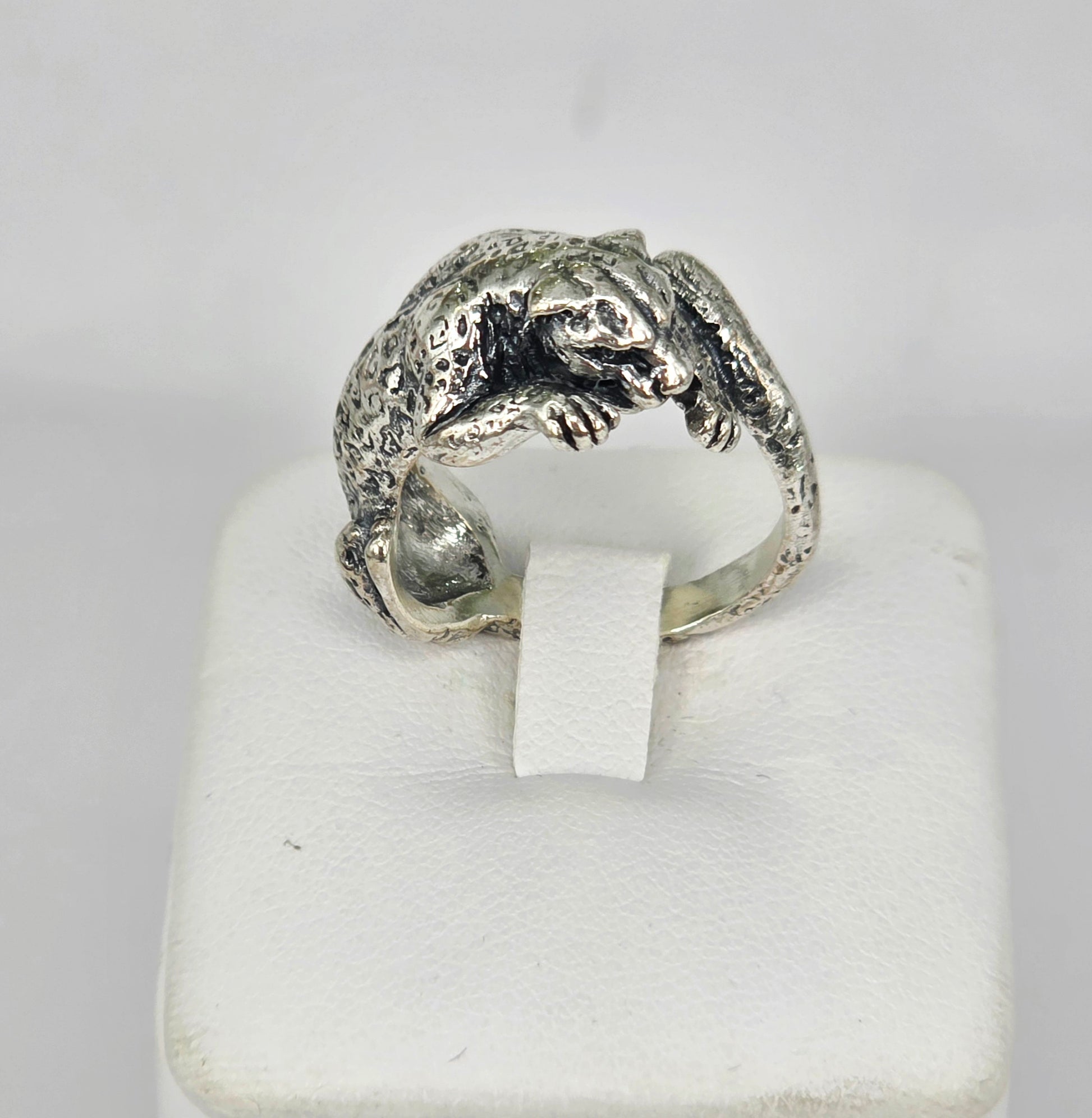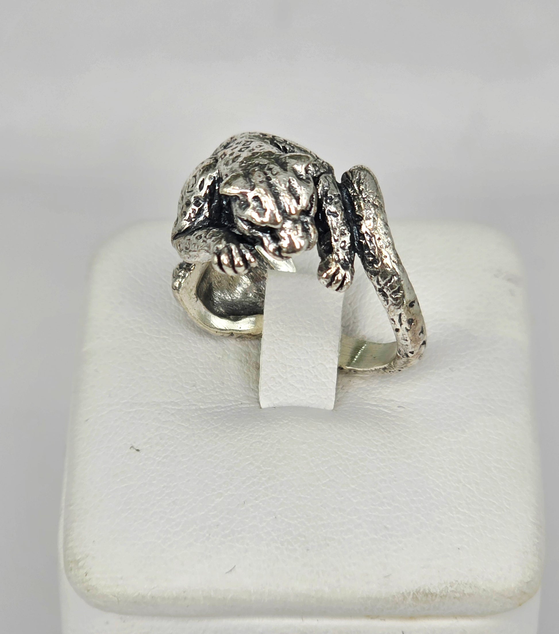 Anello in argento massiccio sapientemente lavorato a mano secondo la tradizione orafa italiana, che riproduce con straordinaria precisione i tratti distintivi di un leopardo. Questo pezzo unico rappresenta un'interpretazione sofisticata dello stile animalier, dove la maestria artigianale si unisce all'eleganza del design contemporaneo. La forma scultorea del felino conferisce carattere e personalità a chi lo indossa, rendendolo un accessorio versatile adatto a qualsiasi occasione e fascia d'età. Realizzato interamente a mano, ogni dettaglio riflette l'esperienza e la dedizione dell'artigiano, garantendo una qualità superiore e un'esclusività che solo i pezzi unici sanno offrire. Un'opera che combina l'arte della gioielleria con l'affascinante bellezza della natura.