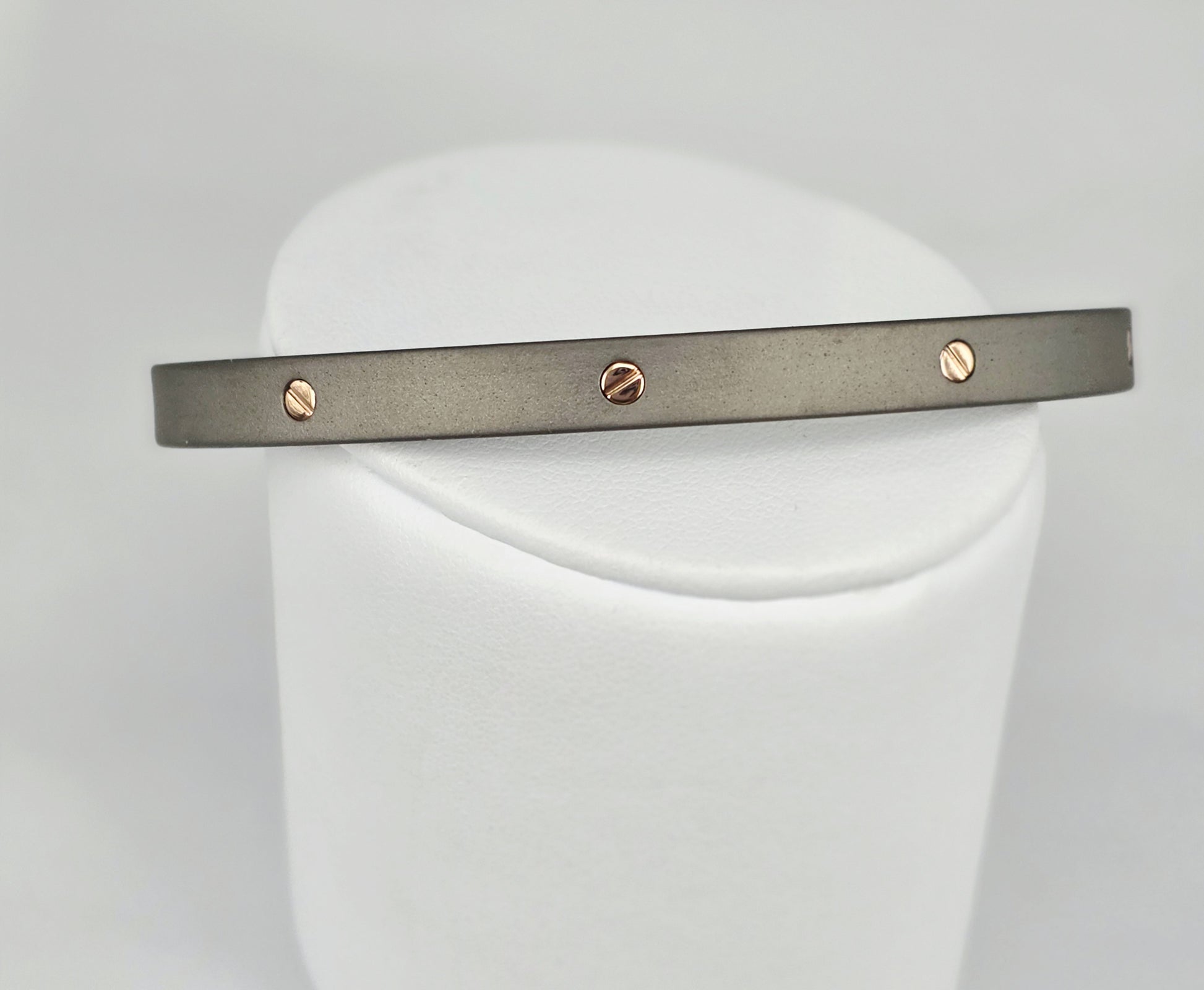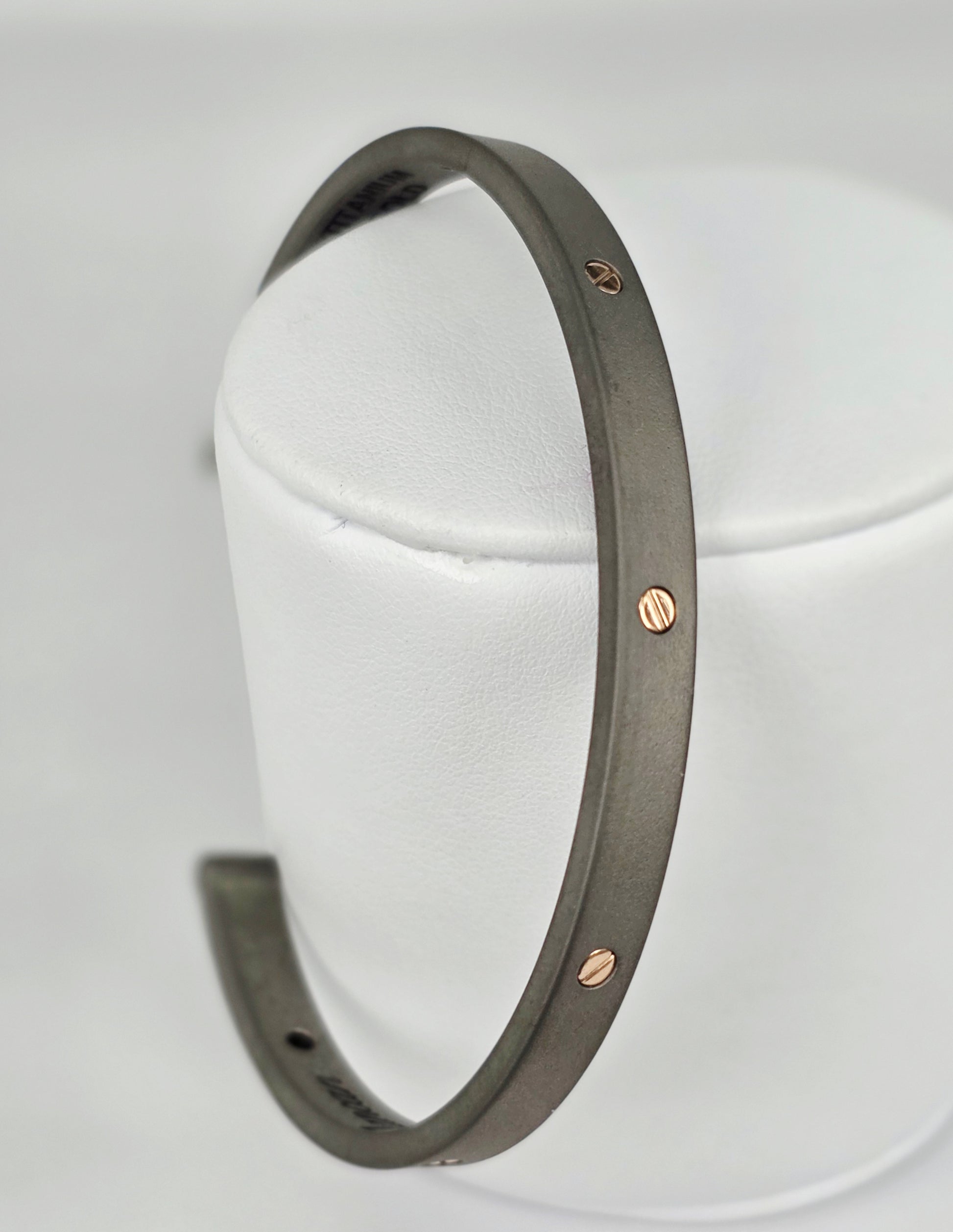Bracciale uomo rigido in titanio impreziosito da dettagli in oro 18 kt, una creazione che unisce solidità e eleganza senza compromessi. Il titanio garantisce leggerezza e resistenza eccezionali, ideale per chi ricerca un accessorio durevole nel tempo. I preziosi dettagli in oro 18 kt conferiscono un tocco di raffinatezza, elevando il design a un livello di sofisticatezza. La struttura rigida assicura una silhouette definita e contemporanea, adatta a qualsiasi occasione e a tutte le età. Un pezzo versatile che si distingue per la qualità costruttiva e l'equilibrio perfetto tra materiali nobili, rappresentando l'eccellenza della gioielleria moderna.